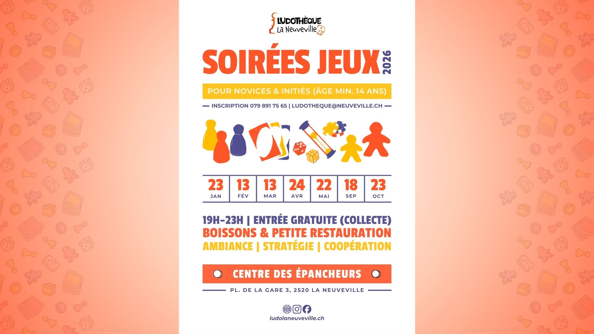 Envie de partager un moment ludique et convivial ? Venez (re)découvrir de nombreux jeux de société en compagnie des ludothécaires de La Neuveville ! Soirée jeux de société pour adultes et ados | Âge min. 14 ans | Entrée libre (collecte) | Inscription par téléphone ou SMS au 079 891 75 65 ou par e-mail […]